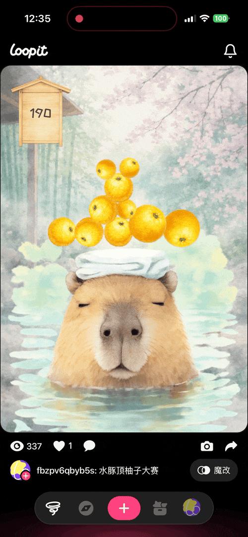 △打开Loopit,就能看到单列Feed流中,有用户发布的各种互动内容,比如用手指滑动掉落的柚子,让它们在卡皮巴拉头上保持平衡。图源:作者试用