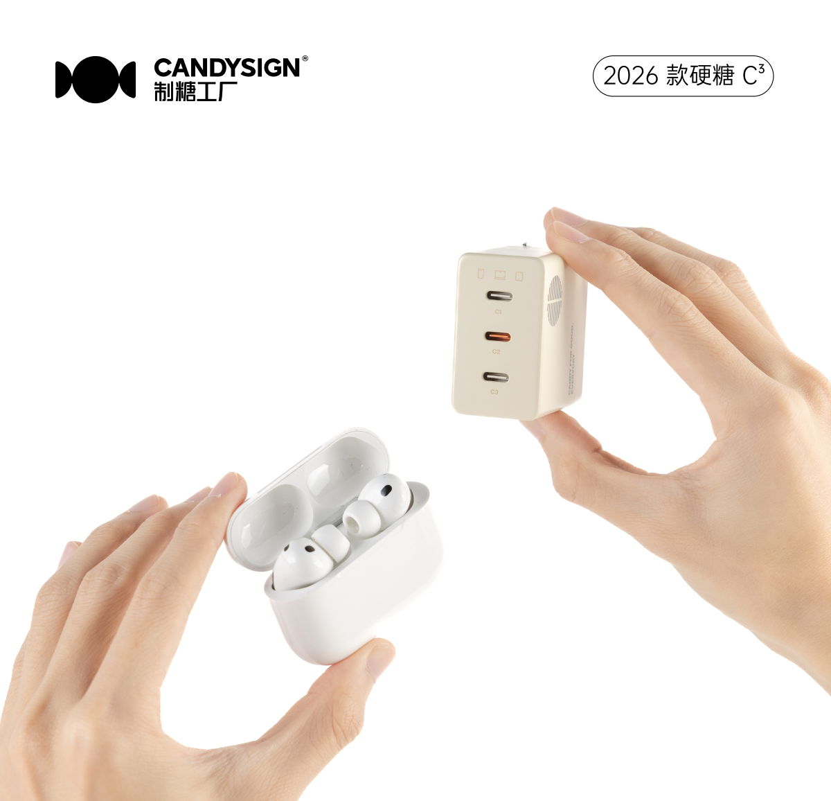 2026 款硬糖 C³ 延续了制糖工厂一贯的复古美学设计,致敬经典博朗风格,使其不仅是充电工具,更成为一件精致的数字时尚单品。其机身尺寸仅与 AirPods 相当,配合可折叠插脚设计,可轻松放入口袋或随身包内,实现真正的“无感随行”。独特的垂直力学结构确保了在各种插座上的稳固使用,彻底告别充电头松脱的烦恼。