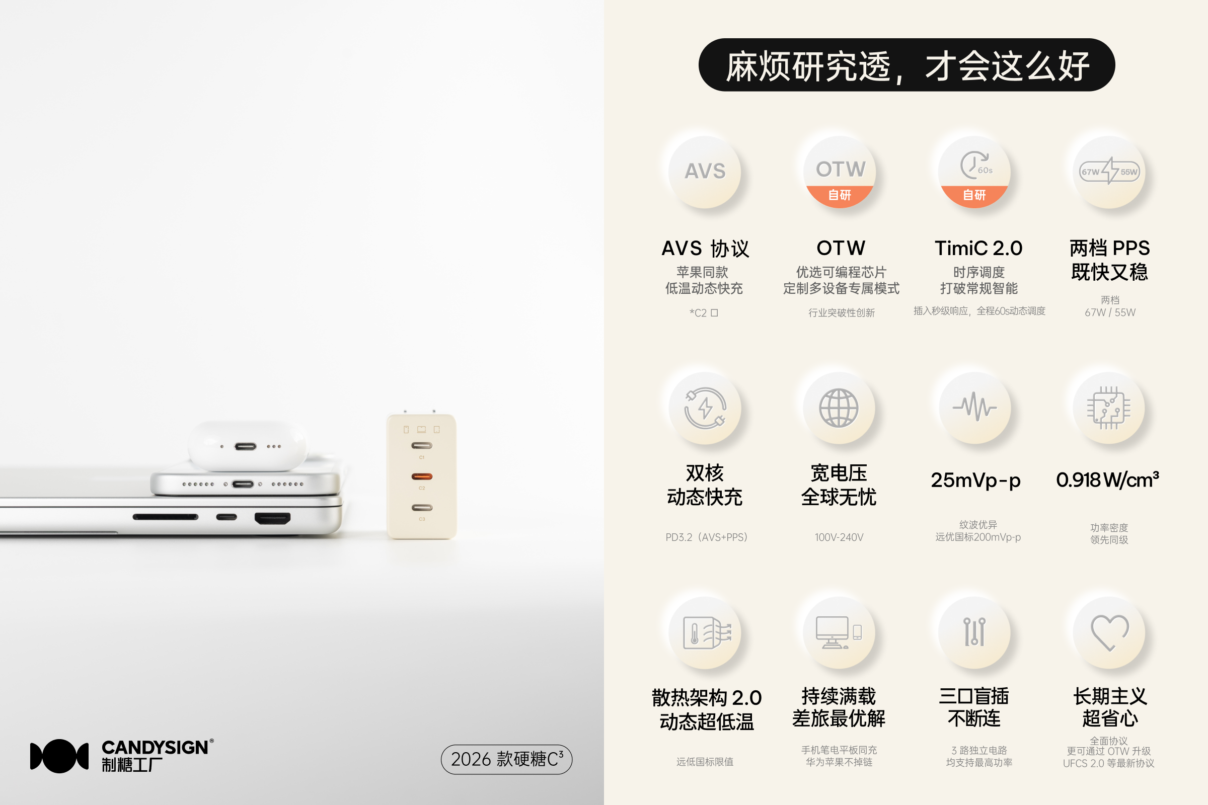 2025 年 12 月 23 日,制糖工厂正式发布 2026 款硬糖 C³。这是一次跨代升级,集极致便携、智能调度与高性能输出及全面协议于一体,将三口充电器做到极致, 是制糖工厂彻底研究过用户困扰与麻烦后,打造的作品,有颜有料,被称为「懂行之选」。